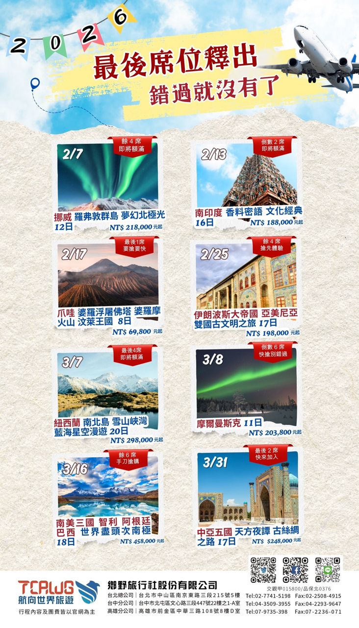 [情報] 年初多團最後席次|北歐極光/中亞/南美