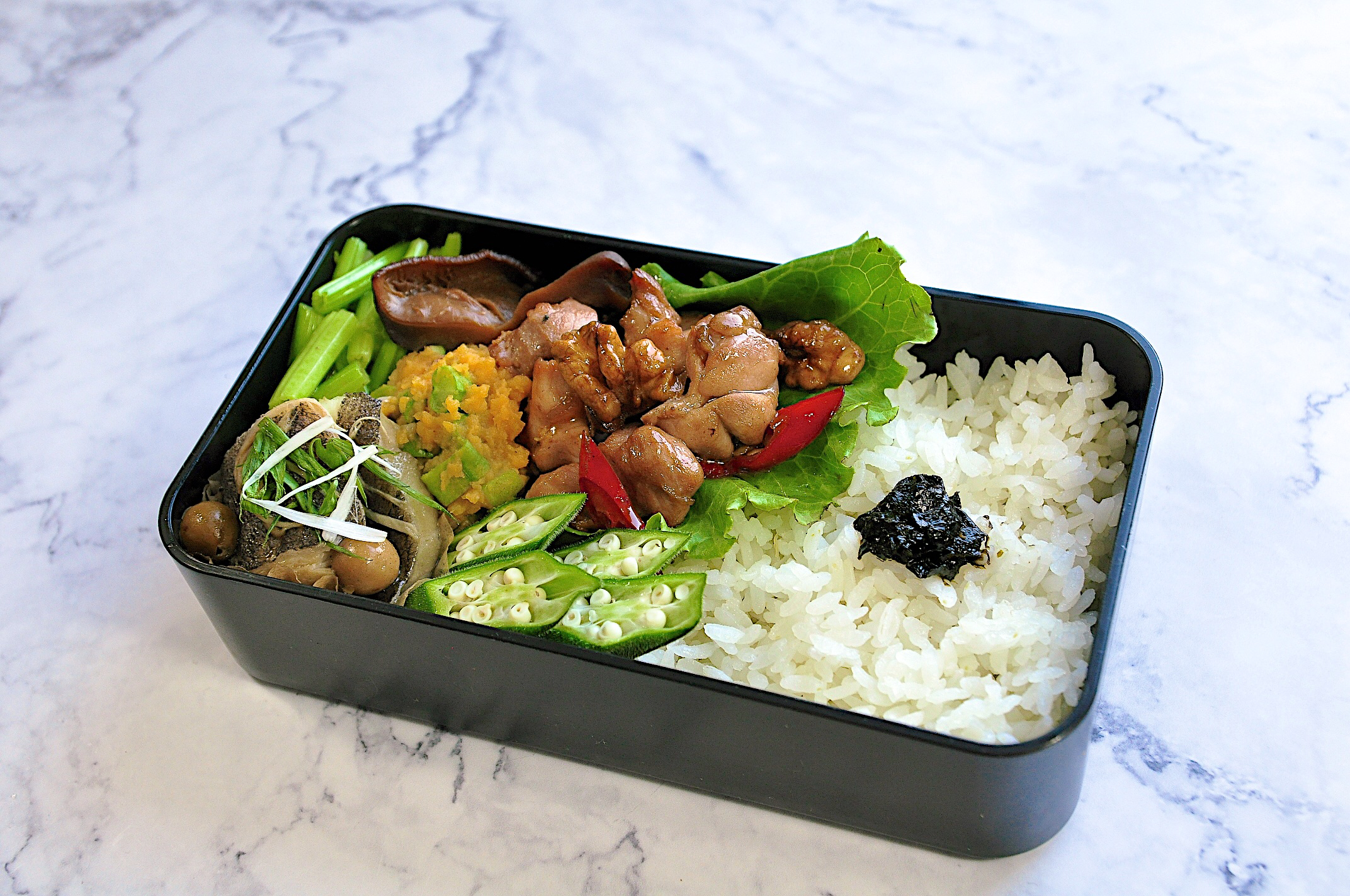 宮保雞丁、薯泥拌豆、海苔佃煮、炒芹菜