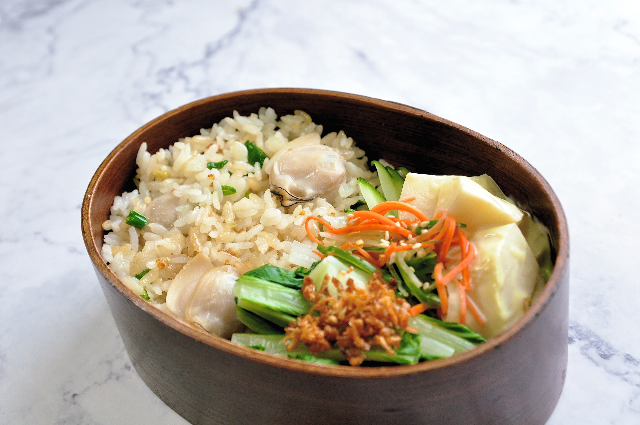 蛤蠣蒸飯、涼筍、炸蔥奶油白菜、醋拌雙絲
