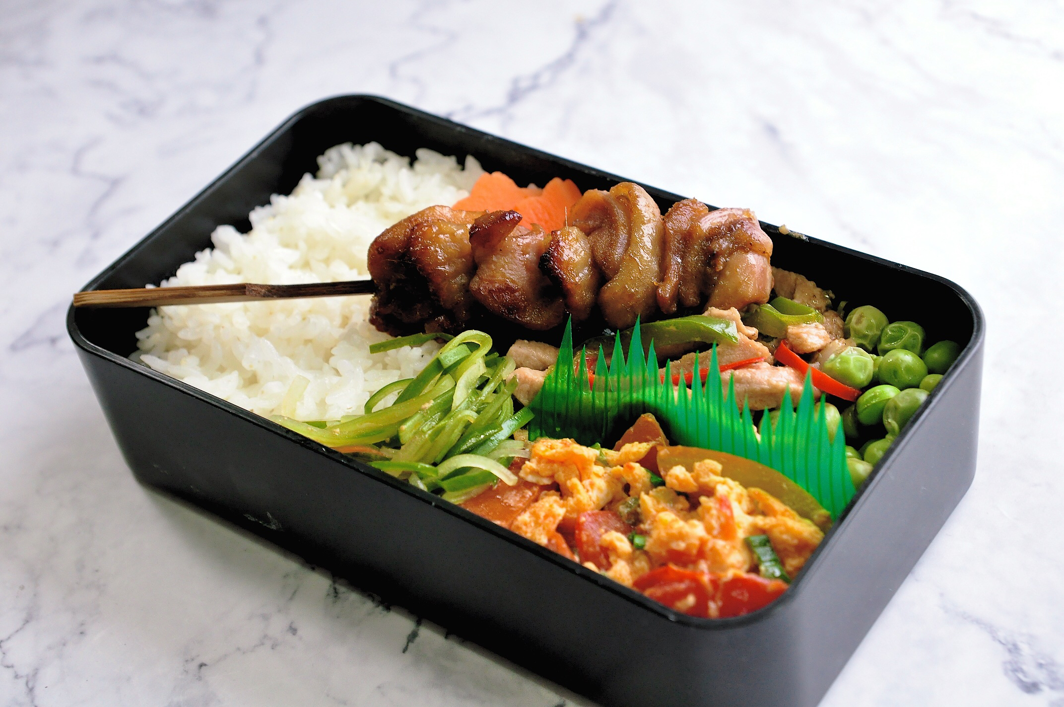 青椒炒肉絲、小黃瓜絲、烤雞肉串、番茄炒蛋、青豆