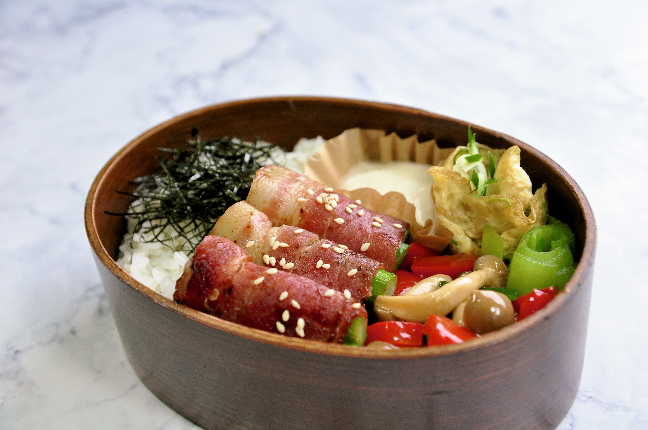 山藥泥、培根蘆筍捲、青江菜、蔥蛋捲、小黃瓜絲、紅椒燴菇
