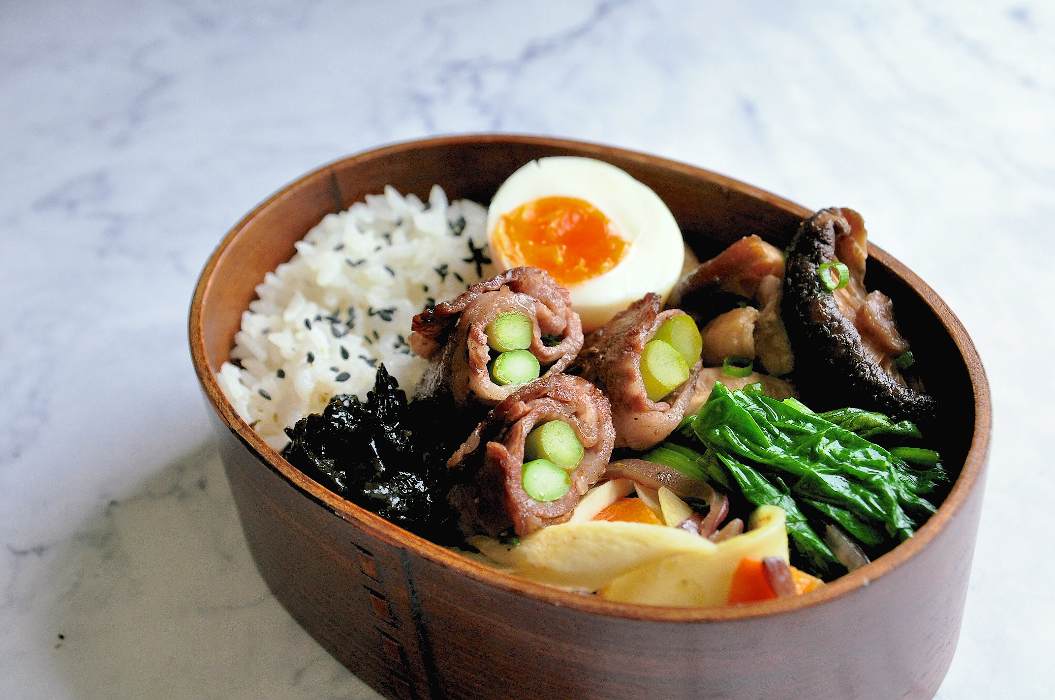 牛肉蘆筍、筊白筍炒木耳、溏心蛋、青菜、雞肉香菇煮物
