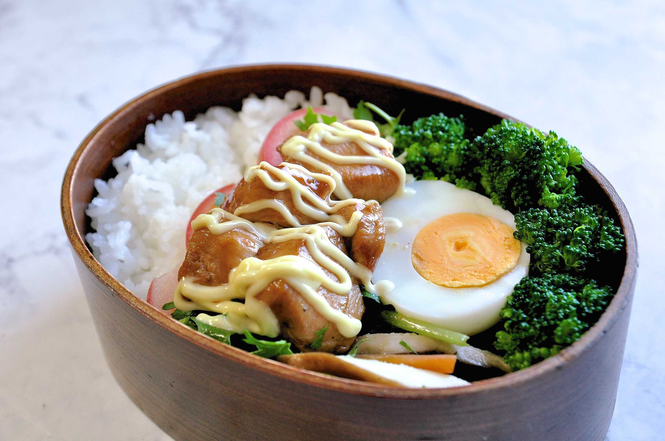 美乃滋照燒雞、香菜番茄片、水煮蛋、香菇水菜、花椰菜