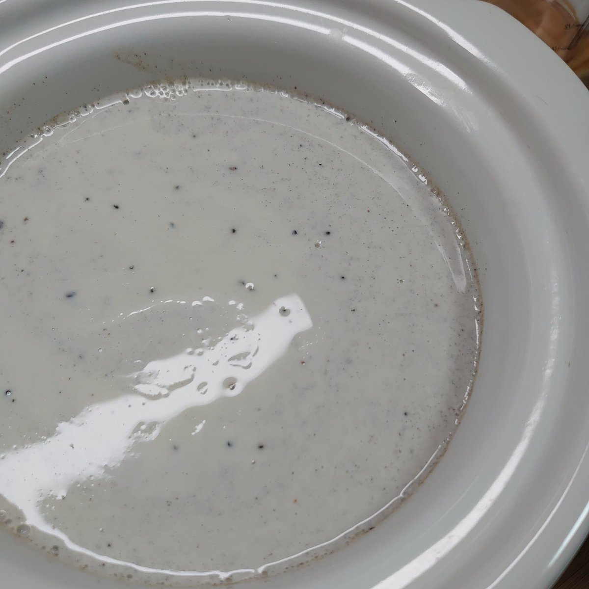 把剛剛稀釋的芝麻糊跟豆漿混和均勻後倒入鍋子