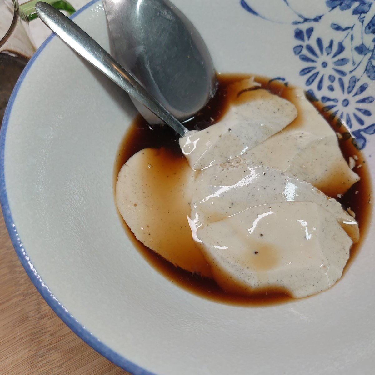 : : 蓋好放進冰箱放個幾小時,整個豆花已經是無出水,相當於布丁的硬度了。