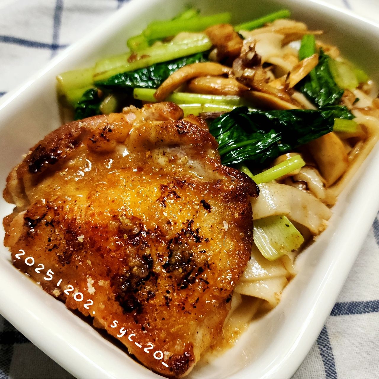 煎雞腿排佐香料鹽/辣炒杏鮑菇粄條