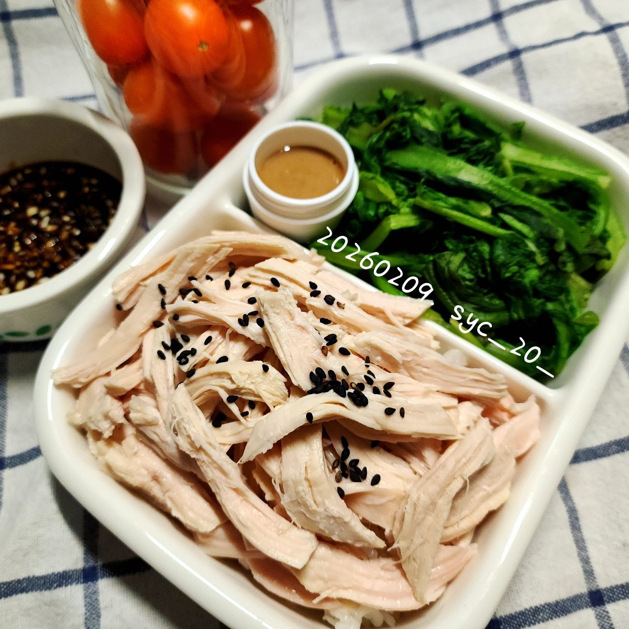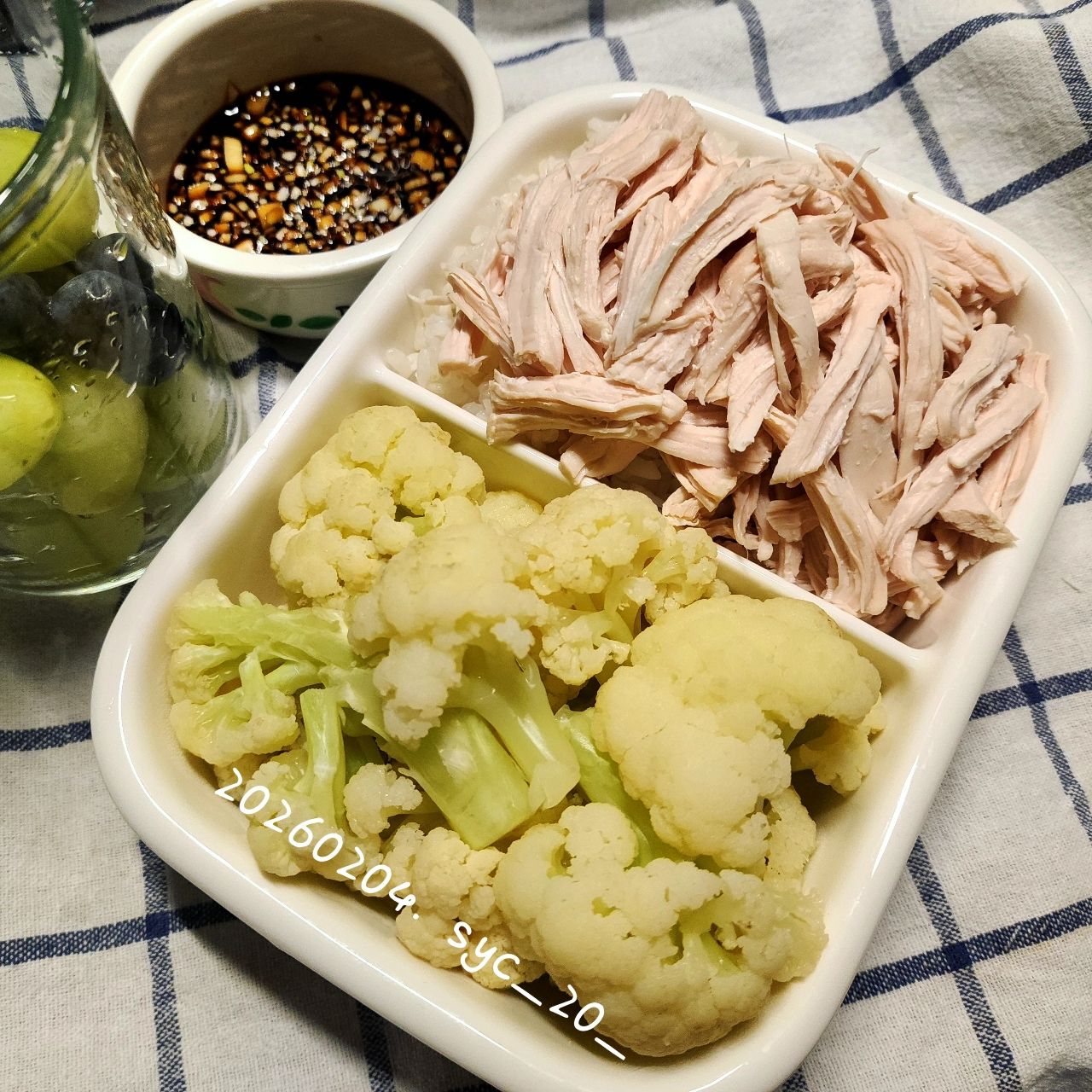 雞肉絲蘸蒜末醬油/微波白花椰菜