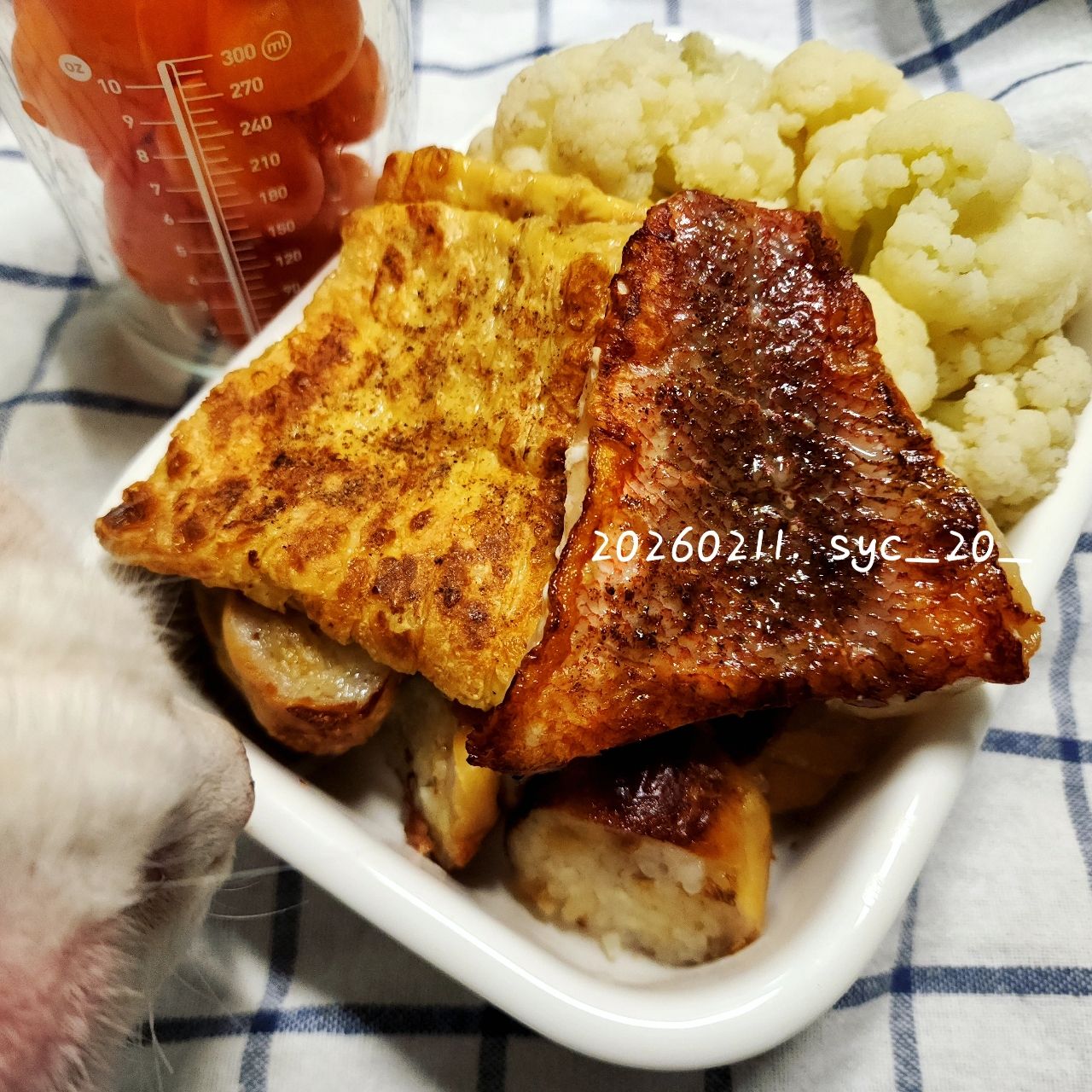 煎紅魚排/清蒸白花椰菜/煎生豆包/糯米腸