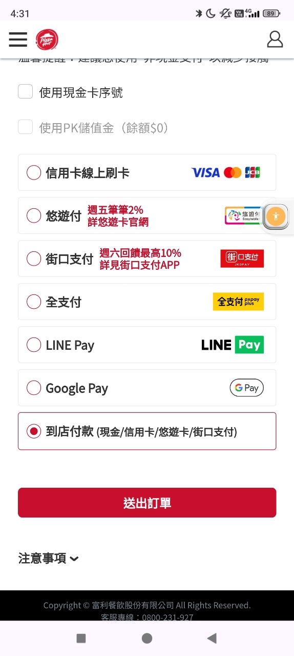 必勝客基本上同上表,差在LINE 購物可以選到店付款。