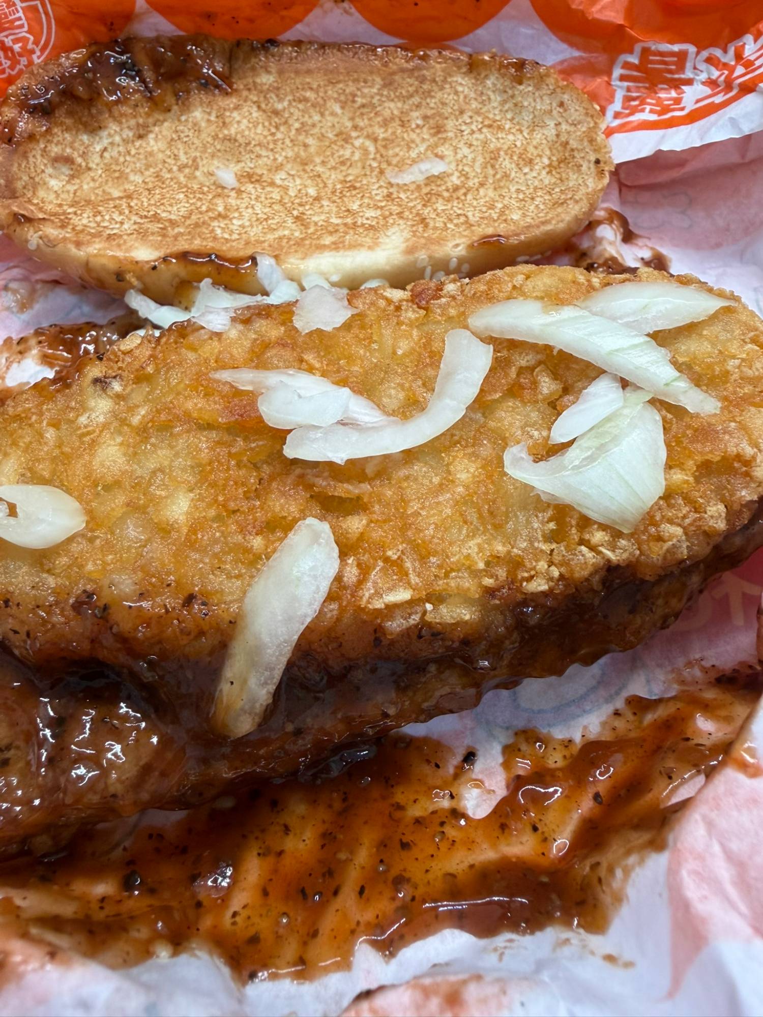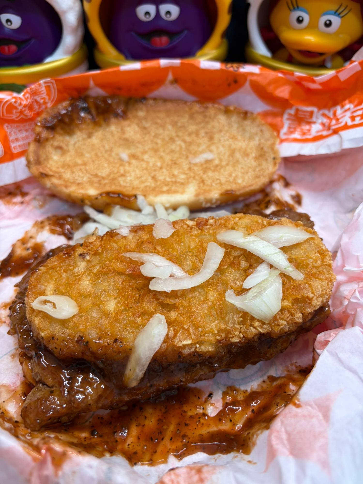 薯來堡:麵包、生洋蔥、牛/雞肉排、黑胡椒醬、薯餅