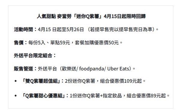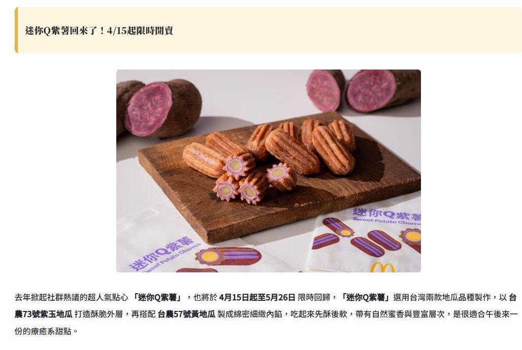 [情報] 麥當勞 迷你Q紫薯 4/15回歸開賣