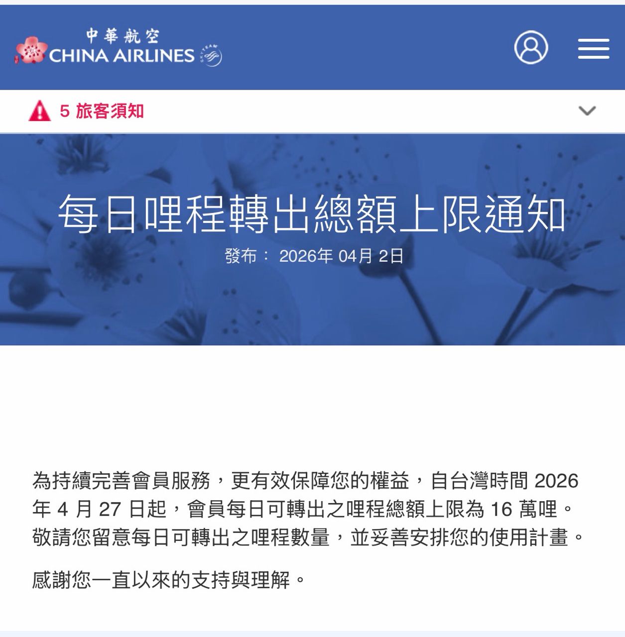 2026 年 4 月 27 日起,會員每日可轉出之哩程總額上限為 16 萬哩。