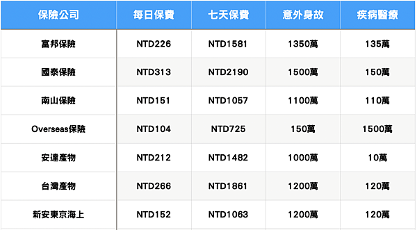 以今年費用來看,台灣本土的旅平險 南山、新安東京CP都算蠻高的