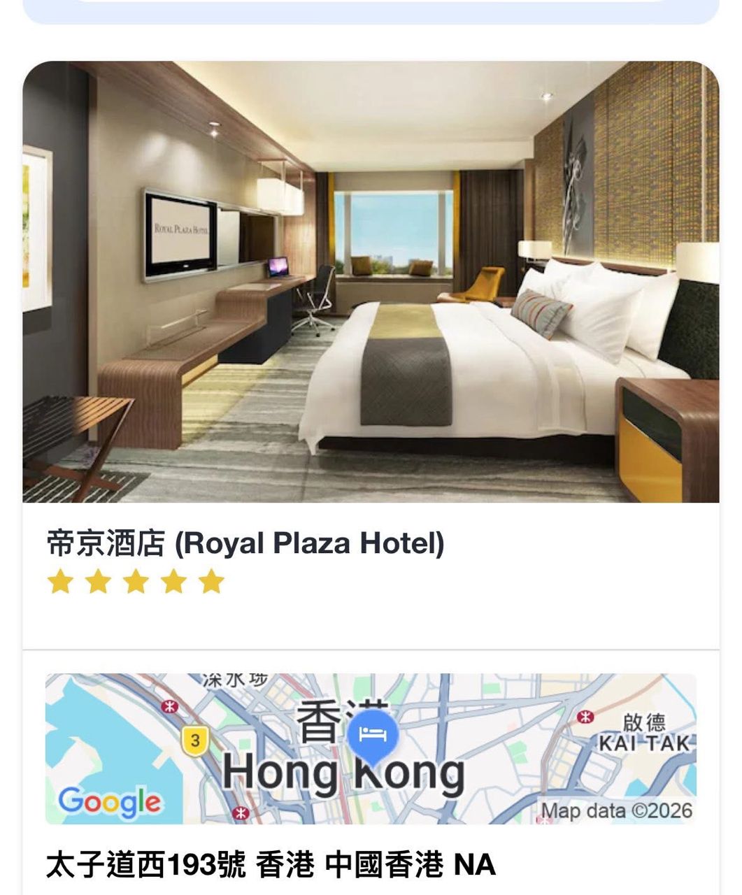 ‧ 飯店名稱: 香港帝京酒店 (Royal Plaza Hotel)