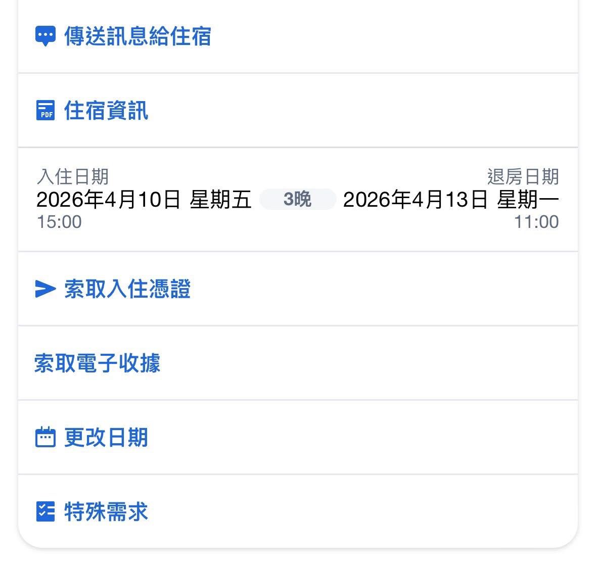 ‧ 退房日期: 2026年4月13日 (週一) — 共 3 晚